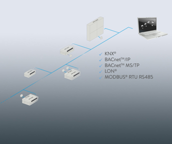 Airmasters PIR- och CO2-givare kan anslutas och aggregat- och givardata kan överföras till BMS nätverket. På så sätt minskas installations-, drift och underhållskostnaderna.