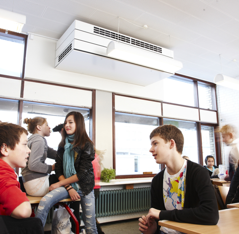 AM 500 är anpassad för att ventilera medelstora lokaler. Beroende på lokalen och aggregatets placering monteras en horisontell eller vertikal modell.